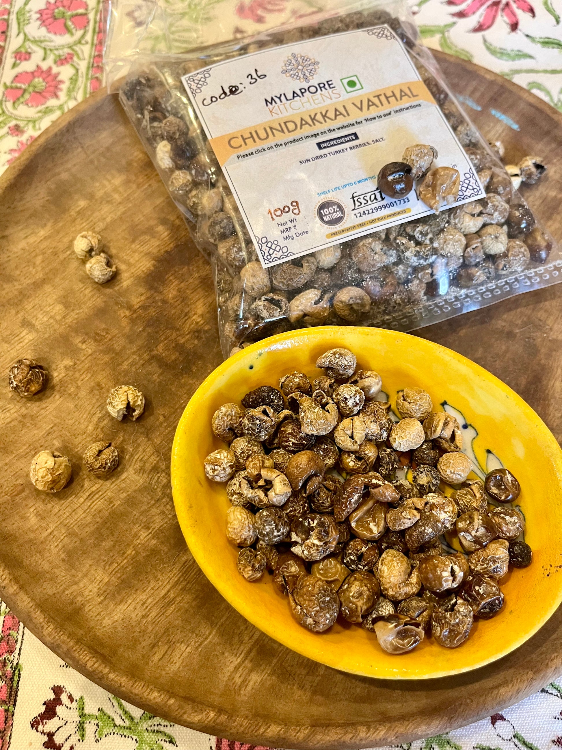 Nutritional Values: Chundakkai Vathal, prepared by soaking turkey berries in buttermilk and salt before sun-drying, retains some of the nutrients of the fresh berries, including fiber and potential antioxidants. The buttermilk adds protein content.