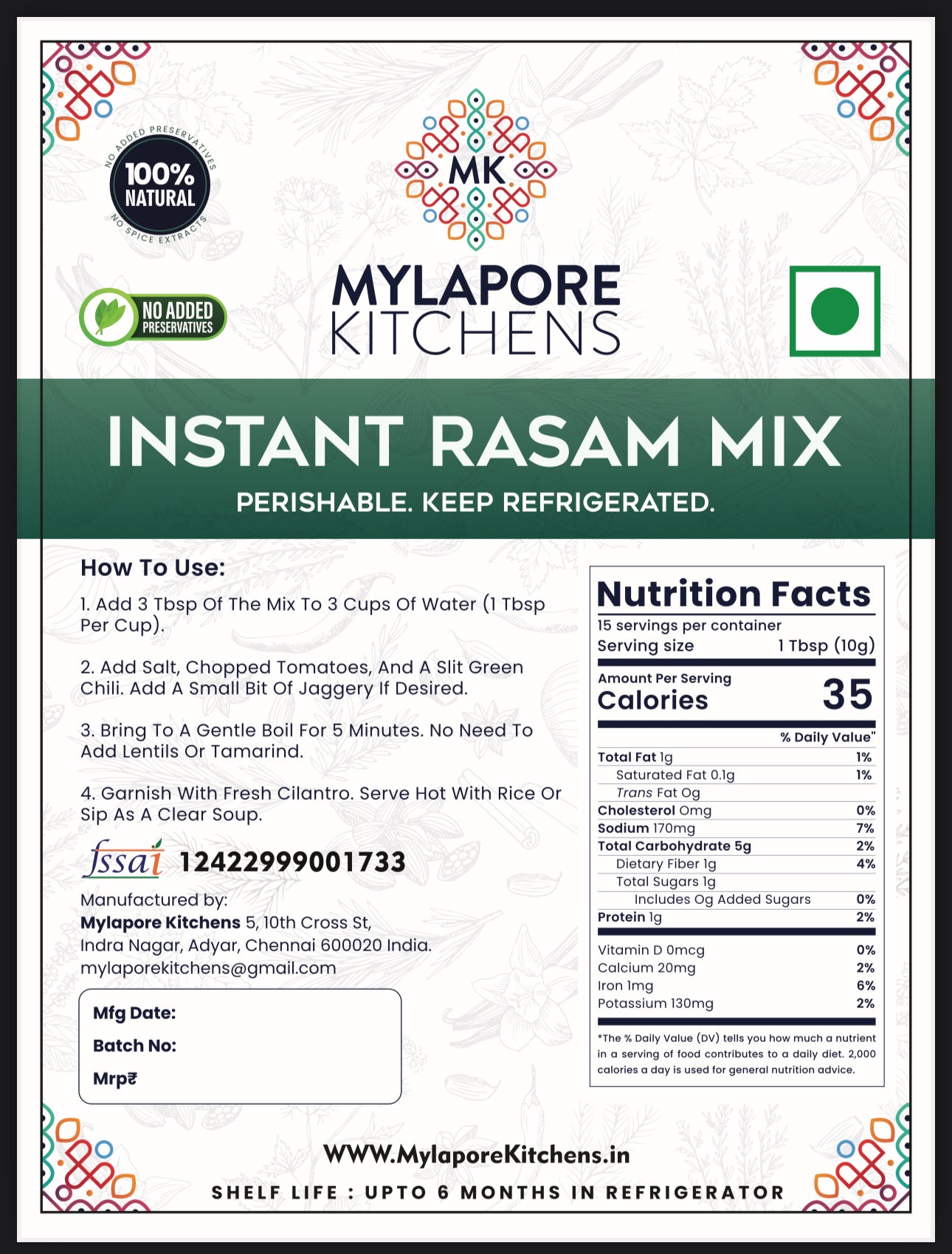 Easy to use Instant Rasam powder - use 3 tbsp of the powder to serve 4 people. Approx 1 tbsp per cup of water, adjust to taste and consistency preferred.