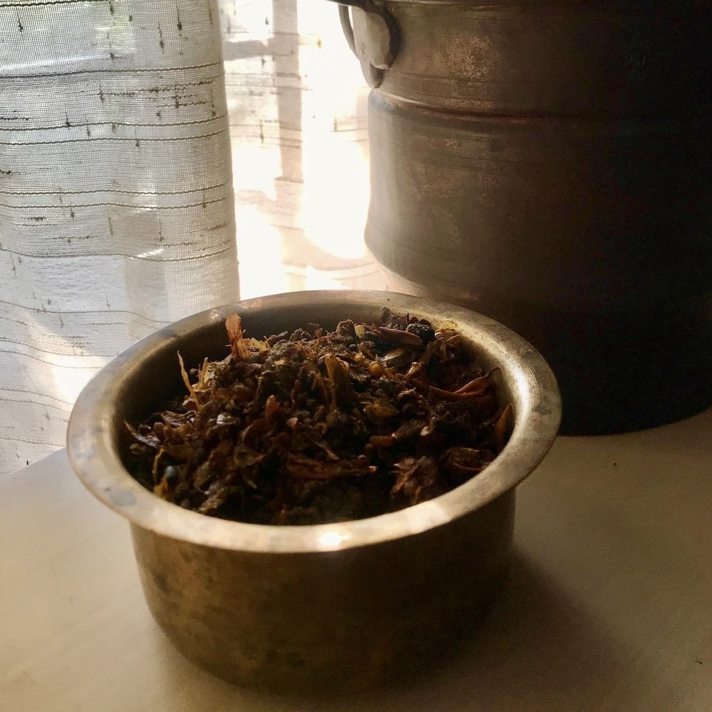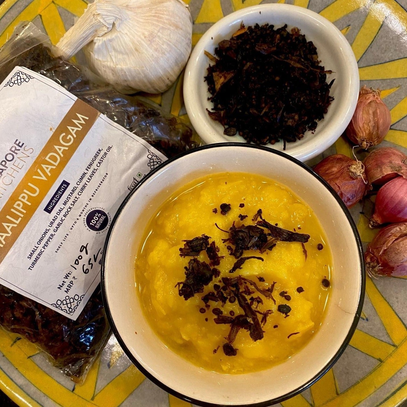 Ingredients include small onions, garlic, turmeric, mustard, urad dal, methi, salt. To use as a garnish. Lightly fry in ghee.